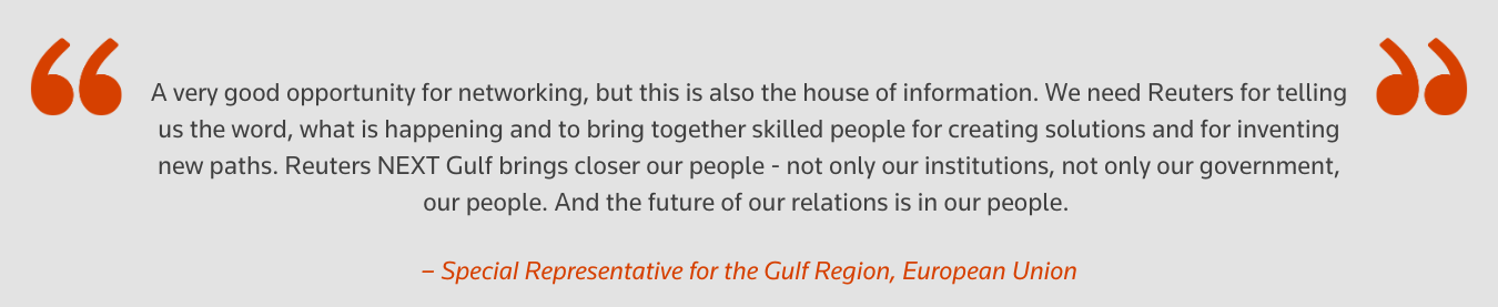 Reuters NEXT Gulf combines Reuters’ global reach as the trusted source of news and information, with the insights and expertise of our partners to create powerful convening space for leaders and changemakers from across the region.